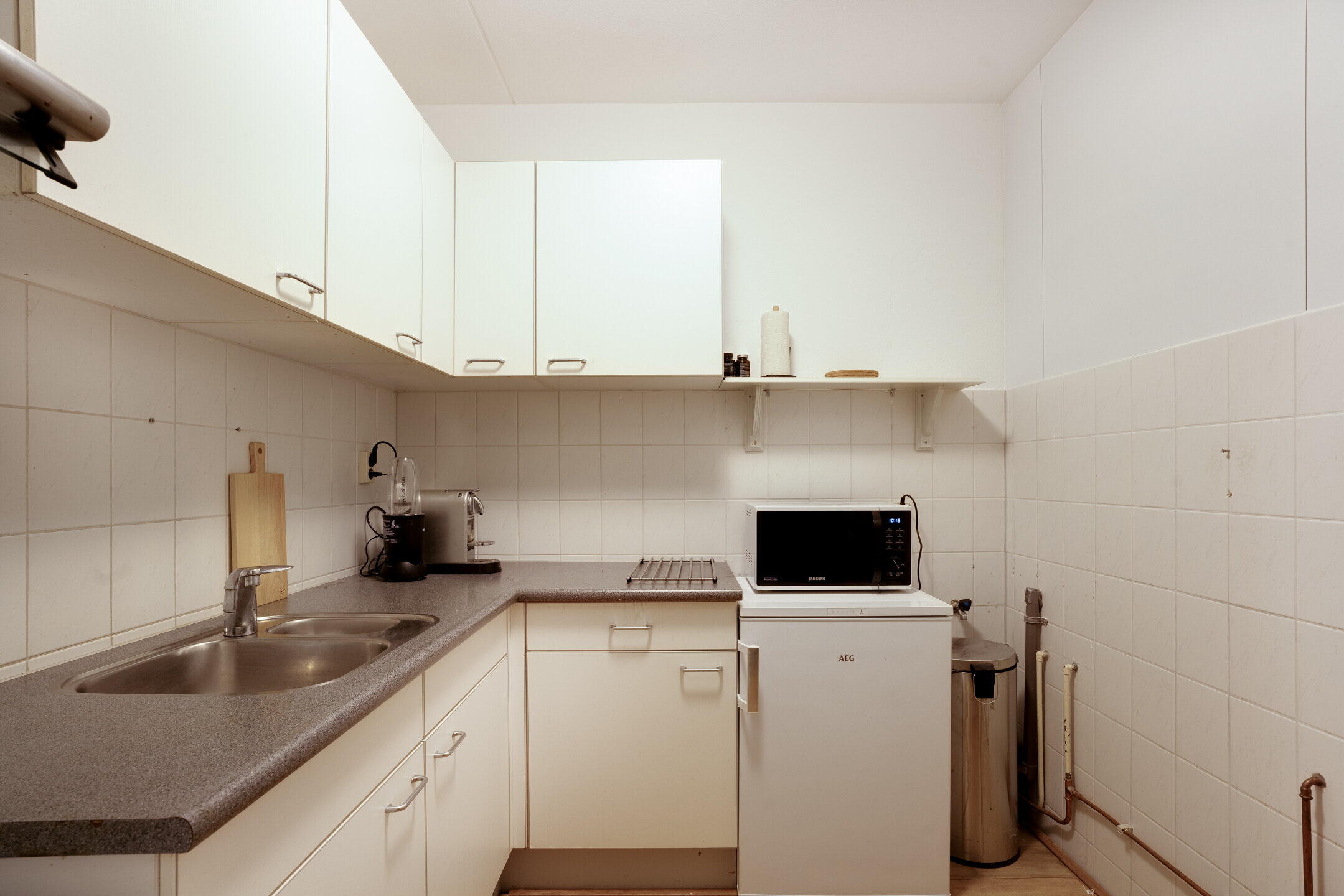 De woonkamer is ruim en licht en staat in verbinding met de open keuken, die is voorzien van een eenvoudig maar functioneel keukenblok. Vanuit de woonkamer is het balkon bereikbaar.